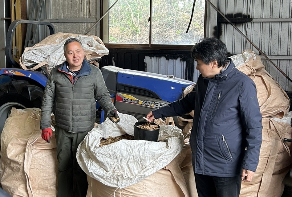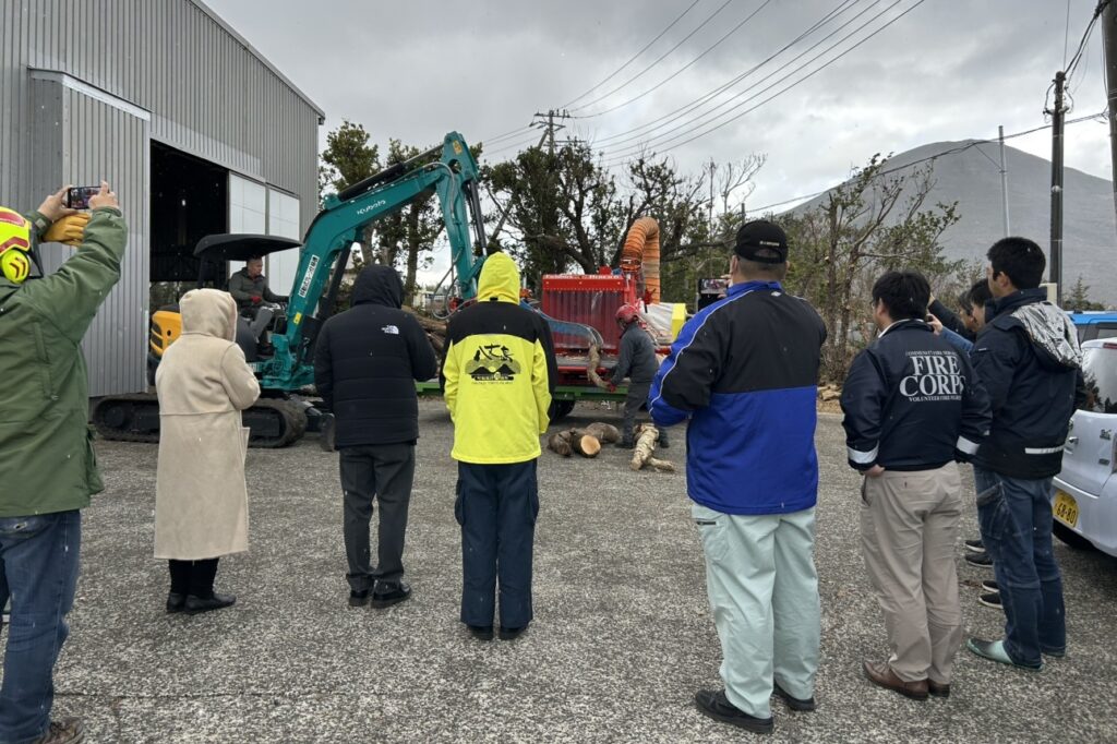 説明会では、ボイラーの仕組みや導入効果に加え、島内の森林資源を活用した木質チップの生産工程を実際にご覧いただき、本プロジェクトの特長である「地産地消による持続可能なエネルギーの取り組み」についてご説明しました。特に島内の伐採木は、燃料として非常に優れており、今後さらなる活躍が期待されます。